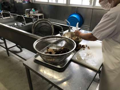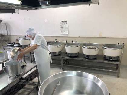 5名で430食を作ります。ご飯は大きな炊飯器5台を使います。