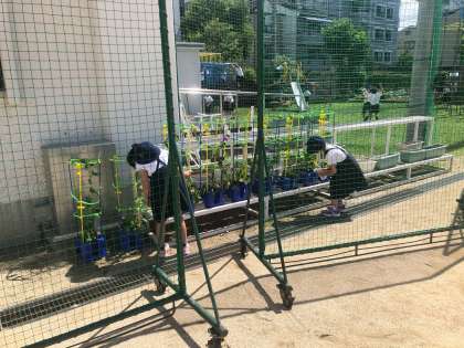 生活科で、1年生はアサガオを育てています。2年生は野菜を育てています。