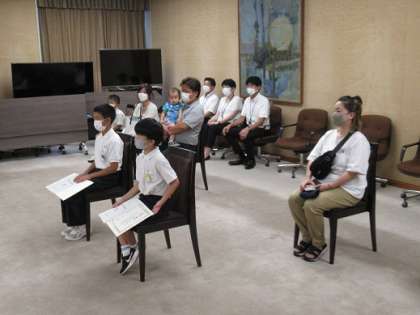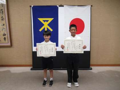 昨年度末に教育長表彰がありましたが、新型コロナウイルスの影響で、実施できませんでした。行事等が可能となるのが9月以降ということもあり、昨日、当時6年生(現在中学1年生)と3年生(現在4年生)の2名の児童が表彰を受けました。