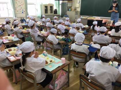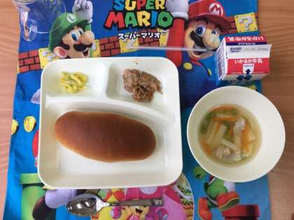 今日の給食献立は、黒糖パン・豚肉のデミグラスソース・キャベツとコーンのソテー・野菜スープ・牛乳です。