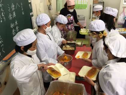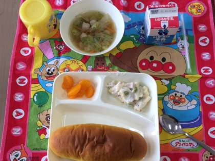 今日の給食献立は、パンプキンパン・マカロニグラタン・レタスのスープ・みかん(缶詰め)・牛乳です。