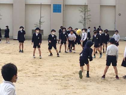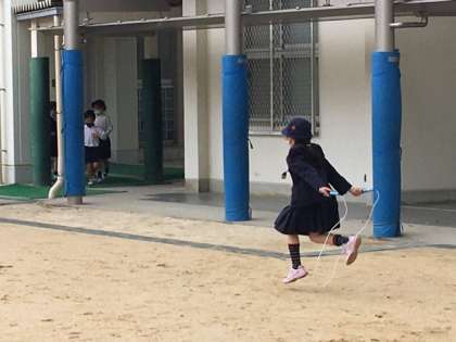 いつものように、たくさんの児童が運動場に遊びに出てきました。オニゴのジャンケン、ドッジボール、縄跳び、鉄棒。それぞれ元気に走って跳ねています。