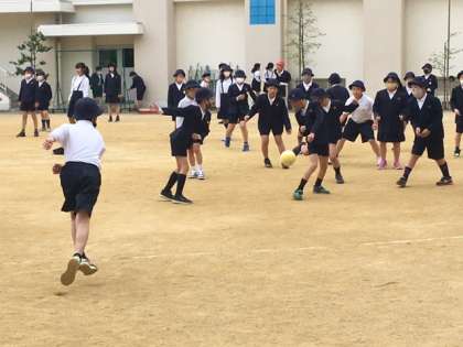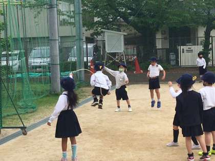 運動場の端っこで、長縄跳びで楽しく跳ぶ2年生の子どもたちも現れました。