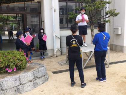 朝礼台では、児童会の6年生が「はじめましての会」の練習をしていました。