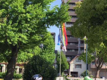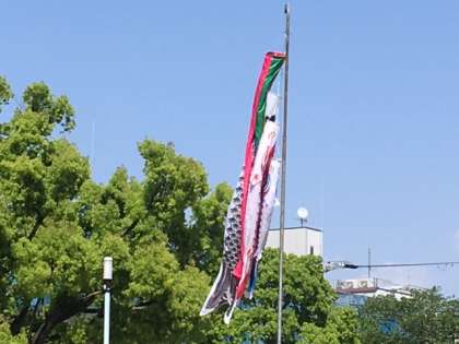 学校の前にある長柄公園(通称パンダ公園)に鯉のぼりが上がりました!