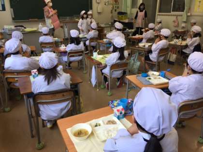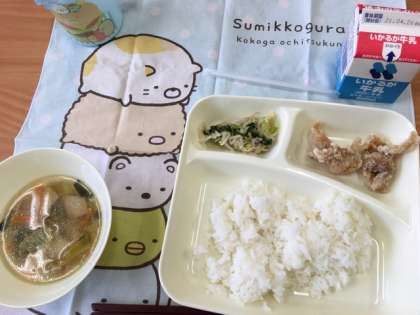 今日の給食献立は、ごはん・鶏肉のから揚げ・チンゲンサイともやしの甘酢あえ・中華スープ・牛乳です。