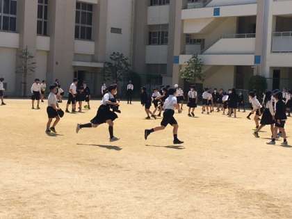 運動場の真ん中では、いつものように花形のドッジボールです。元気にオニゴで走っている子どもたちもたくさんいます。