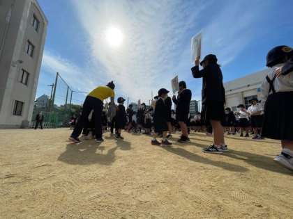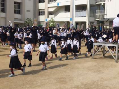 毎週木曜日の朝、1年生から6年生までの全校児童が縦割り班で仲良く遊ぶ「児童集会」の第一回めです。