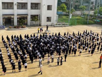今朝、すがすがしい晴天の下、運動場で「はじめましての会」を行いました。