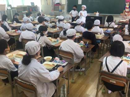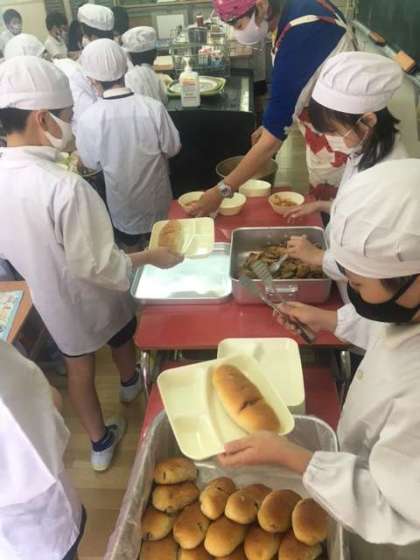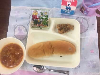 今日の給食献立は、ぶどうパン・一口トンカツ・ミネストローネ・豆こんぶ・牛乳です。