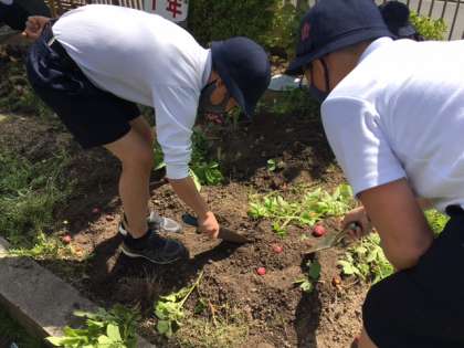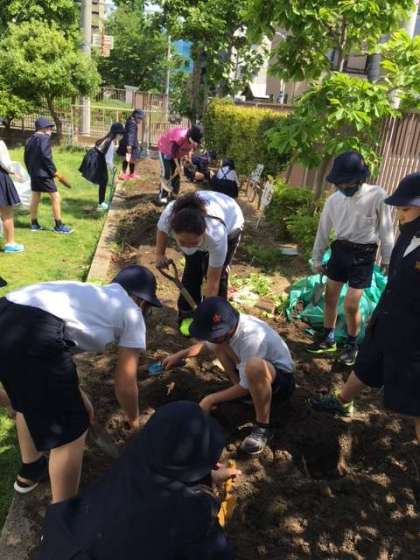 4年生の理科学習の一環で、遊具広場横の学習園で芋植えの準備をしました。