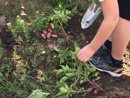 まず、土を耕します。スコップで掘ると、昨年のサツマイモの種芋がゴロゴロ出てきました。いっしょにミミズや虫たちも出てきたので、ワーワーキャーキャー大騒ぎです。