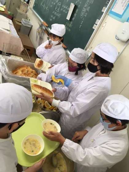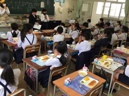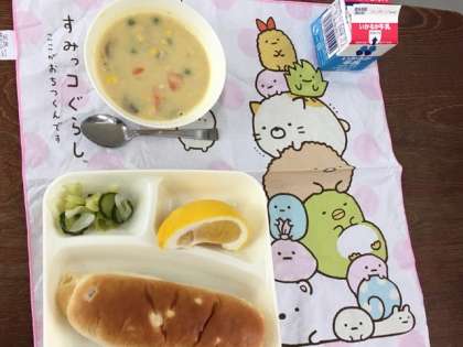 今日の給食献立は、おさつパン・コーンクリームシチュー・キャベツときゅうりのサラダ・河内ばんかん・牛乳です。