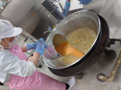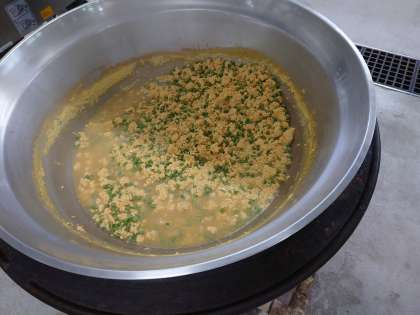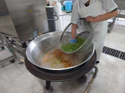 剥いて洗ったえんどう豆を香り立つだしの中に投入します。