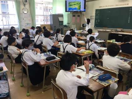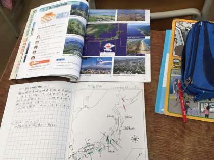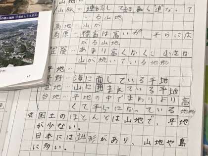 社会科をしています。地理の分野で、地形の学習をしていまいた。