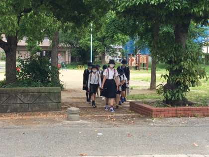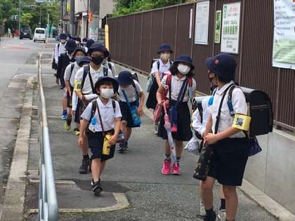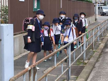 集団登校班では、どの班も高学年の児童が、低学年の児童を常に気にかけて歩いてくれています。