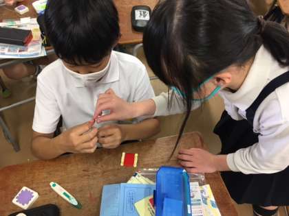 次に玉結び、玉止めをします。なかなかできない子に隣の子が上手に教えてあげていました。ありがとう!