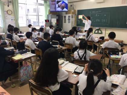 5年生の家庭科の授業で、「名前の縫い取り」の学習です。