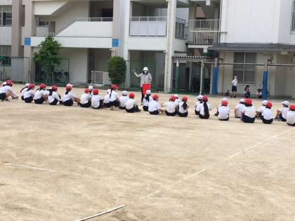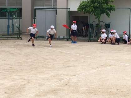 5年生は、運動場で「全国体力テスト50メートル走」の練習をしました。みんな、全力で駆け抜けます。