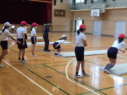 体育館では、6年生がマット運動をしています。ジャンプ!