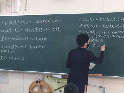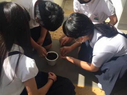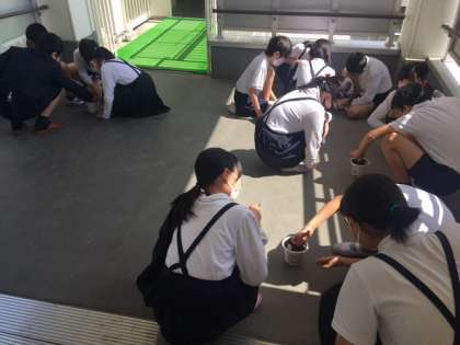 今朝の1時間め、それぞれがこれから育てるひまわりへの思いを書きました。その思いを確認してから、班ごとの鉢に「はるかのひまわり」のタネを植えました。