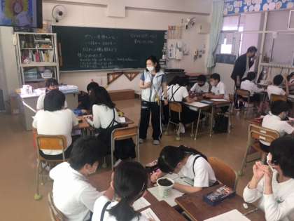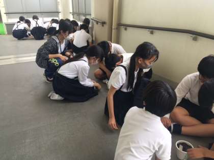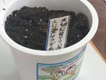 6時間め、6年1組と3組も「はるかのひまわり」のタネを植えました。班員の名前を書いたプレートの裏に、自分たちの思いも書きました。