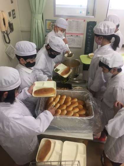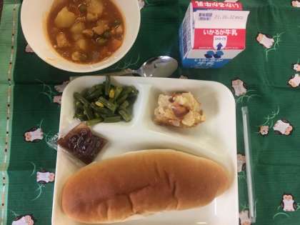今日の給食献立は、コッペパン・ケチャップ煮・さんど豆とコーンのソテー・りんごのクラフティ・いちごジャム・牛乳です。
