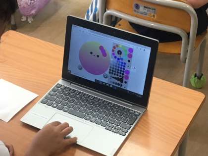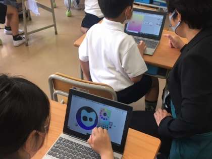 2年生では、それぞれがお絵かきを楽しみました。自由にカラフルな絵やデザインを描きます。今どき、ゲーム感覚です。2年生がパソコンを扱えることは、驚くほどのことではないんですね〜。