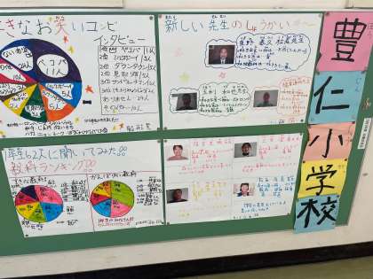 豊仁小学校のあれこれを新聞委員会児童が取材して記事にしてくれています。好きな教科、頑張りたい教科、好きなキャラクターランキング、春の式な花ランキング、1年生を迎えたはじめましての会について、好きなお笑いコンビ、なんといってもメインは新しく来た先生の紹介です。しっかりできています。