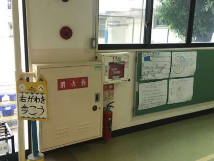 豊仁小学校のAEDは、玄関を入ってすぐの右側にあります。
