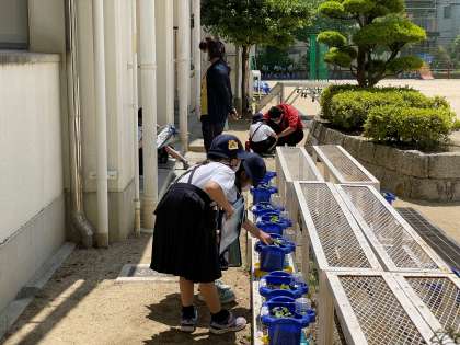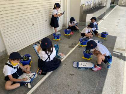 育てている朝顔の観察をしました。暑さを考慮し日陰での活動です。丹精こめて育てている朝顔をよく見てカードに書き込みました。