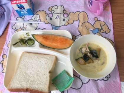 今日の給食献立は、食パン・かぼちゃのクリームシチュー・ミックス海藻のサラダ・クインシーメロン・牛乳です。