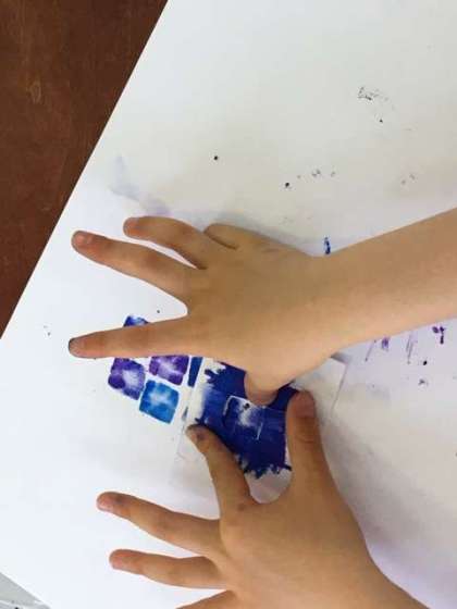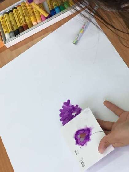 クレヨンでアジサイの花をデザインしています。画用紙を切り抜いて、上からクレヨンを塗ると、きれいなアジサイの葉があらわれました。