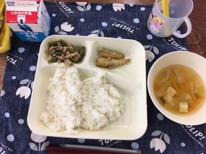 今日の給食献立は、ごはん・イワシの天ぷら・豚肉と三度豆の炒め物・五目汁・牛乳です。