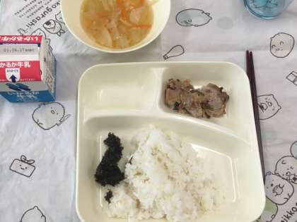 今日の給食献立は、ごはん・豚肉のごま味噌焼き・海苔の佃煮・すまし汁・牛乳です。