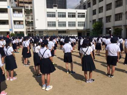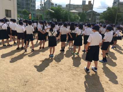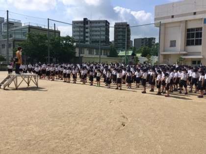 今日は月曜日、全校朝会の日です。夜間に大雨が降りましたが、運動場は朝の陽射しでずいぶん乾いたので、朝会を行うことができました。