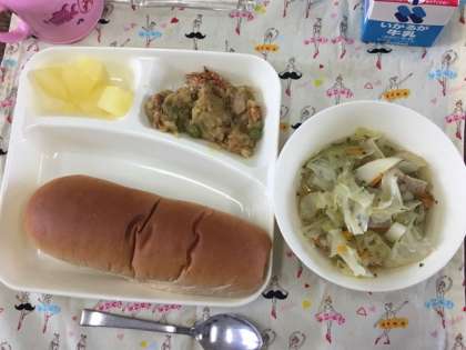 今日の給食献立は、黒糖パン・カレードリア・豚肉とキャベツのスープ・りんご(缶詰め)・牛乳です。