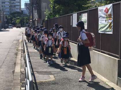 梅雨の合間、快晴です。子どもたちは今日も集団登校班で元気に登校してきました。
