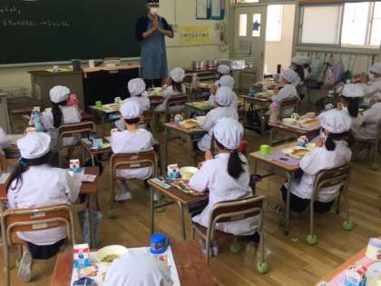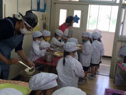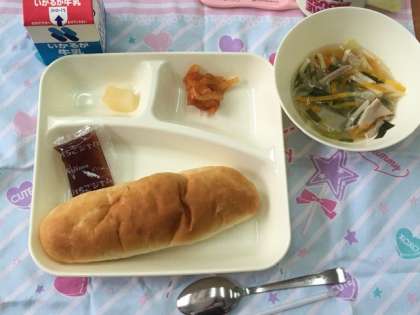 今日の給食献立は、コッペパン・えびのチリソース煮・中華スープ・和梨(缶詰め)・牛乳です。