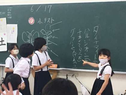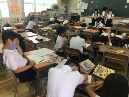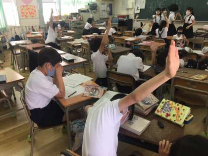 3年生のクラスで、何かを決めています。みんな目隠しをして、選びたいものに手を上げます。