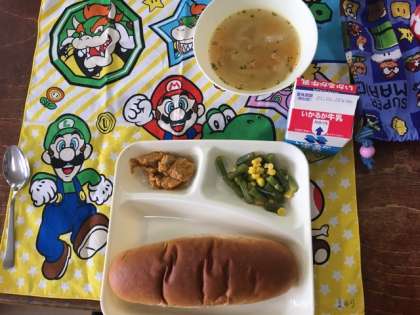 今日の給食献立は、黒糖パン・鶏肉のカレーマヨネーズ焼き・三度豆とコーンのサラダ・てぼ豆よスープ・牛乳です。