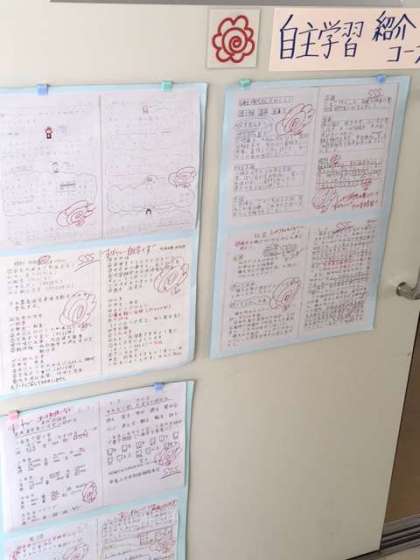 「自主学習ノート」。コピーが6年生の教室の壁に掲示されています。