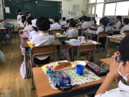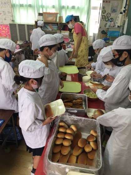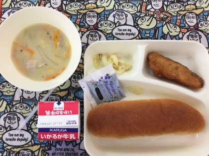 今日の給食献立は、コッペパン・サーモンフライ・キャベツのソテー・豆乳スープ・ブルーベリージャム・牛乳です。