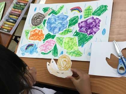 クレヨンでアジサイを描きました。紫色の一色ではなくて、色んな色を使って描いています。梅雨の季節のカタツムリやカエルなどの生き物も描いてくれました。