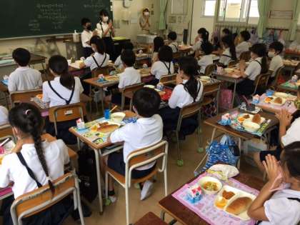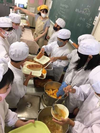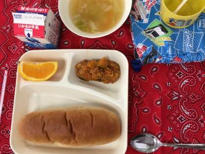 今日の給食献立は、黒糖パン・かぼちゃのミートグラタン・野菜スープ・オレンジ・牛乳です。