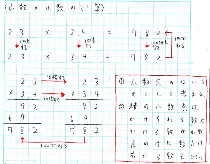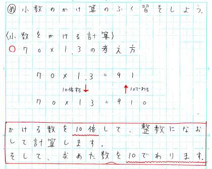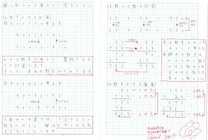 特に、小数同士のかけ算については、答えの小数点の位置を間違えやすいところから、この概念がとても大切です。こうしたことがノートでは丁寧にまとめることができています。これからの学習にもぜひ生かしてもらいたいですね。