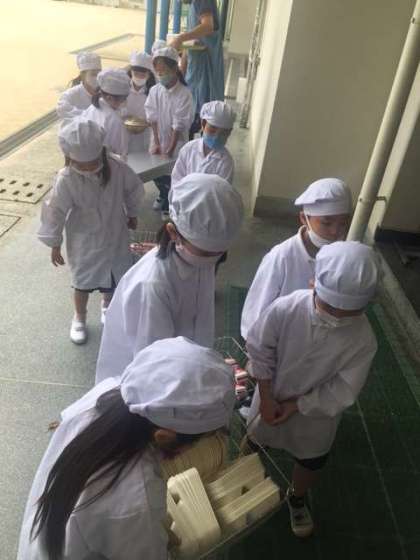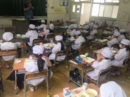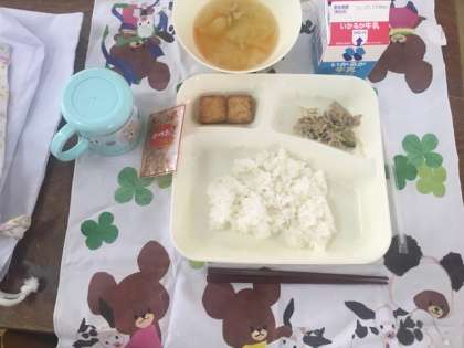 今日の給食献立は、ごはん・ゴーヤチャンプルー・カツオ節(袋)・厚揚げの生姜醤油かけ・すまし汁・牛乳です。
