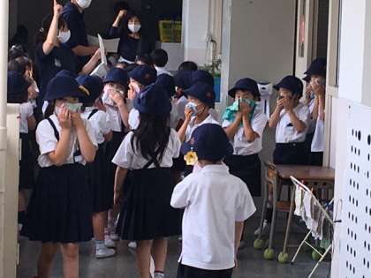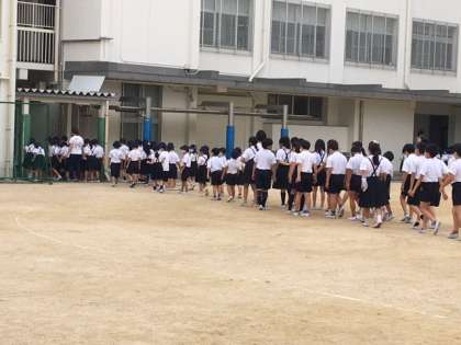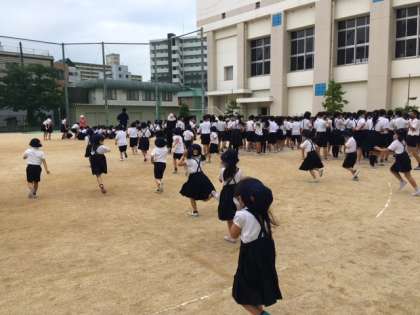 「お・は・し」の約束を守って、スピーカーによる合図の後、みんな急いで、でも整然と運動場に出てくることができました。