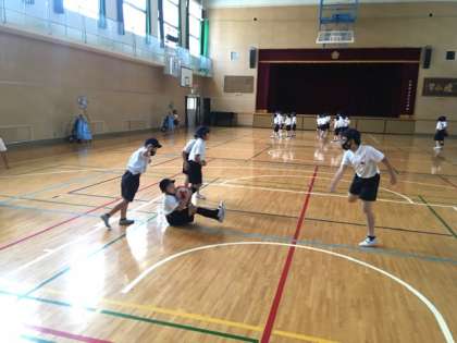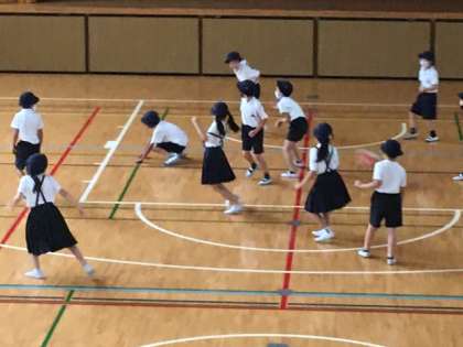 体育館では3年生がみんなでドッジボールをしています。男女仲良く、激しく楽しんでいました。