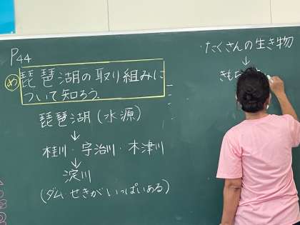 社会科で琵琶湖について学習しました。琵琶湖は我々にとっても大切な水源であること、その水源を守るために様々な工夫と努力がなされていることを学びました。しっかり手が上がっており良い授業を学級が作り上げていました。掃除上手な子のいる4年1組、そのメンバーが結集すれば琵琶湖をも美しくできるやもしれません。